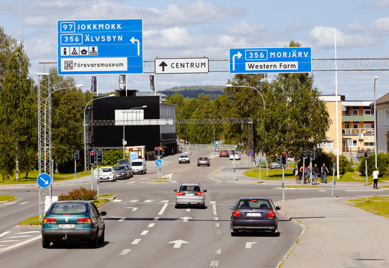 En bild tagen dagtid utomhus som visar en vägkorsning med trafik och flera vägvisningsskyltar. Två stora blå skyltar hänger över vägen med information om vägnummer (97, 356) och destinationer som Jokkmokk, Älvsbyn, Morjärv, samt Forsvarsmuseum och We